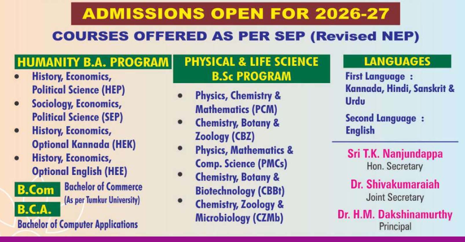 The college is situated in the heart of the city. Apart from being the Garden City, Tumkur is now the natural choice and preferred destination for students from different parts of the country to pursue professional education, be it in Science , Engineering, Medicine or any other field. The city is home to globally renowned corporate houses in the Education sector. The distance to the college from the city railway station and Bus station is half kms. The college has an excellent infrastructure and accessibility from various parts of the city. The college has a well designed administrative block and various other rooms and facilities for the girls common room , waiting room, co-operative store etc. It has provided well equipped furnished labs for basic sciences separately and other departmental laboratories as per the norms of UGC & University. Each section of students has separate classrooms and facilities as per the norms of the UGC. Class rooms are well furnished and ventilated. Audio visual Room is provided with all teaching aids, OHP, Slide Projector, Television, Video Player, LCD Projector, Video Camera, Still Camera, DVD, Multimedia Computer, Audio Systems, Microscopic Projector, etc., in order to ensure overall development of students. The students have all the facilities for games and sports. Adequate infrastructure are provided for indoor and outdoor games and extra-curricular activities. A canteen with both vegetarian food is available in the college campus. The college building has made more provisions for the expansion. Other facility consists of Drawing Hall, Conference Hall etc.
